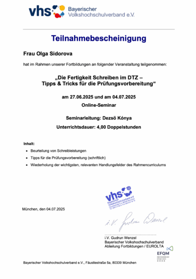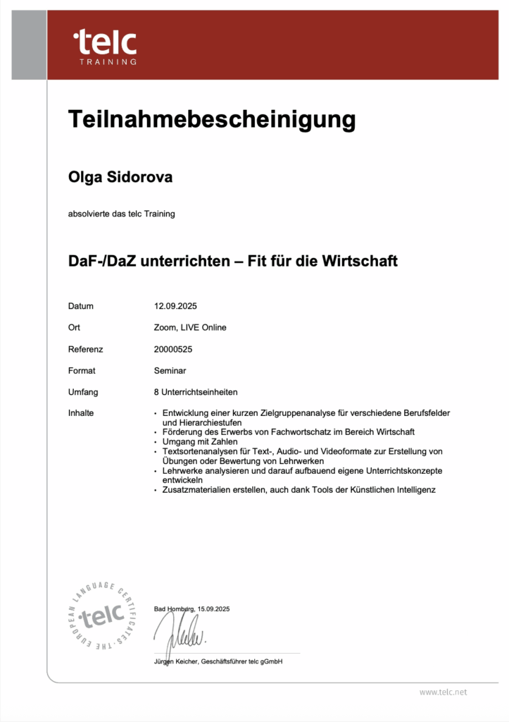 Как преподавателя немецкого меня вдохновляет объединение моего разнообразного опыта в изучении иностранных языков с современной, увлекательной дидактикой и методикой преподавания немецкого. Я постоянно совершенствуюсь, осваиваю новые подходы и прохожу дополнительные квалификации, чтобы моя работа продолжала приносить мне удовольствие, а обучение было максимально эффективным для моих учеников.